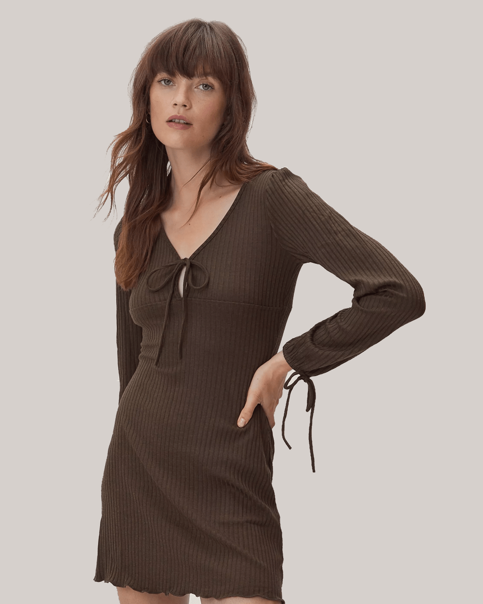 Tie Detail Wide Rib Long Sleeve Mini Dress Was